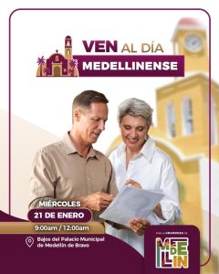 Con el objetivo de fortalecer la cercanía con la ciudadanía y brindar atención directa y oportuna, el H. Ayuntamiento de Medellín de Bravo, encabezado por el alcalde Samuel Acosta, invita a la población a participar en el “Día Medellinense”, que se llevará a cabo este miércoles, en un horario de 9:00 de la mañana a las 12:00 horas.